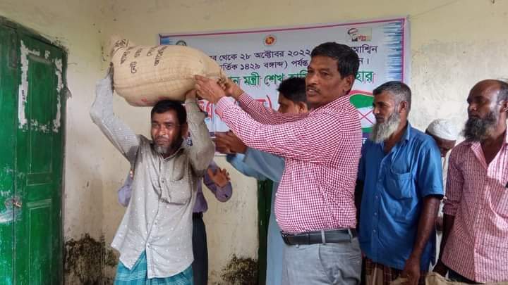 ভোলার তজুমদ্দিন উপজেলার ৪নং চাঁচড়া ইউনিয়নে মাননীয় প্রধানমন্ত্রী জননেত্রী শেখ হাসিনার উপহার মেঘনা নদীনে মৎস আহরন নিষিদ্ধকালে ভিজিএফ কর্মসূচির আওতায় জেলে পরিবারের মাঝে ২৫ কেজি করে চাল বিতরণ করা হয়।