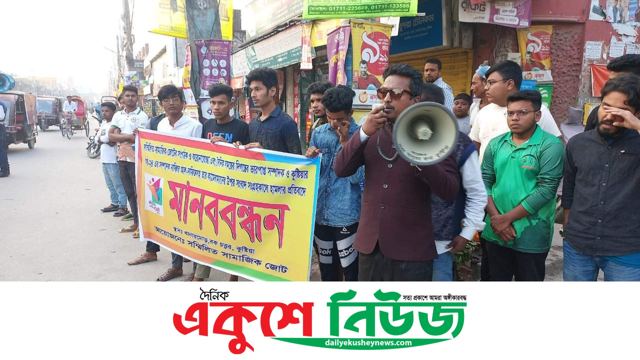 সংগঠক ও সাংবাদিক নাব্বির আল নাফিজের উপর হামলার প্রতিবাদে সম্মিলিত সামাজিক জোটের আয়োজনে কুষ্টিয়া শহরের থানার মোড়ে আজ বিকেল ৪ ঘটিকার সময় মানববন্ধন অনুষ্ঠিত হয়েছে।