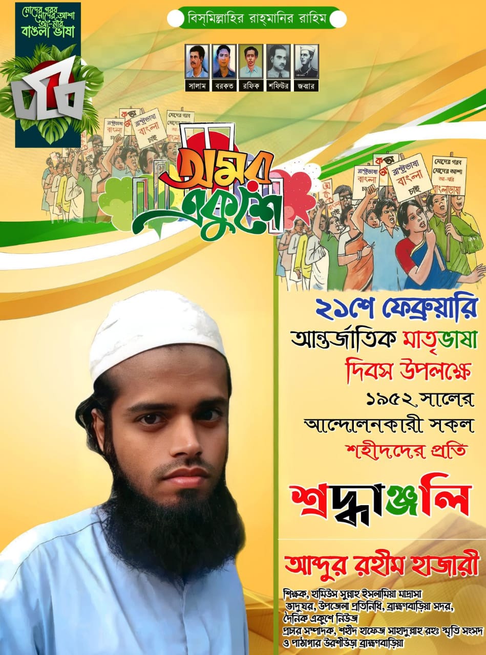 আজ ২১ শে ফেব্রুয়ারী ভাষা আন্দোলন এর শহীদ দিবস ও আন্তর্জাতিক মাতৃভাষা দিবস উপলক্ষে ১৯৫২ সালের ভাষা আন্দোলন এর শহীদ গণের প্রতি শ্রদ্ধা নিবেদন করে তাদের মাগফেরাত কামনা করেন এবং বিশ্বের যে সমস্ত দেশগুলোতে এই দিনটিকে আন্তর্জাতিক মাতৃভাষা দিবস হিসেবে সৃকৃতি দেওয়া হয়েছে ও পালিত হচ্ছে তাদের প্রতি আন্তর্জাতিক মাতৃভাষা দিবস এর শুভেচ্ছা ও অভিনন্দন জানাচ্ছেন দৈনিক একুশে নিউজ এর ব্রাহ্মণবাড়িয়া সদর উপজেলা প্রতিনিধি ও শহীদ হাফেজ সাহাদুল্লাহ রহঃ স্মৃতি সংসদ ও পাঠাগার উরশীউড়া ব্রাহ্মণবাড়িয়ার প্রচার সম্পাদক কবি হাফেজ আব্দুর রহীম হাজারী।
