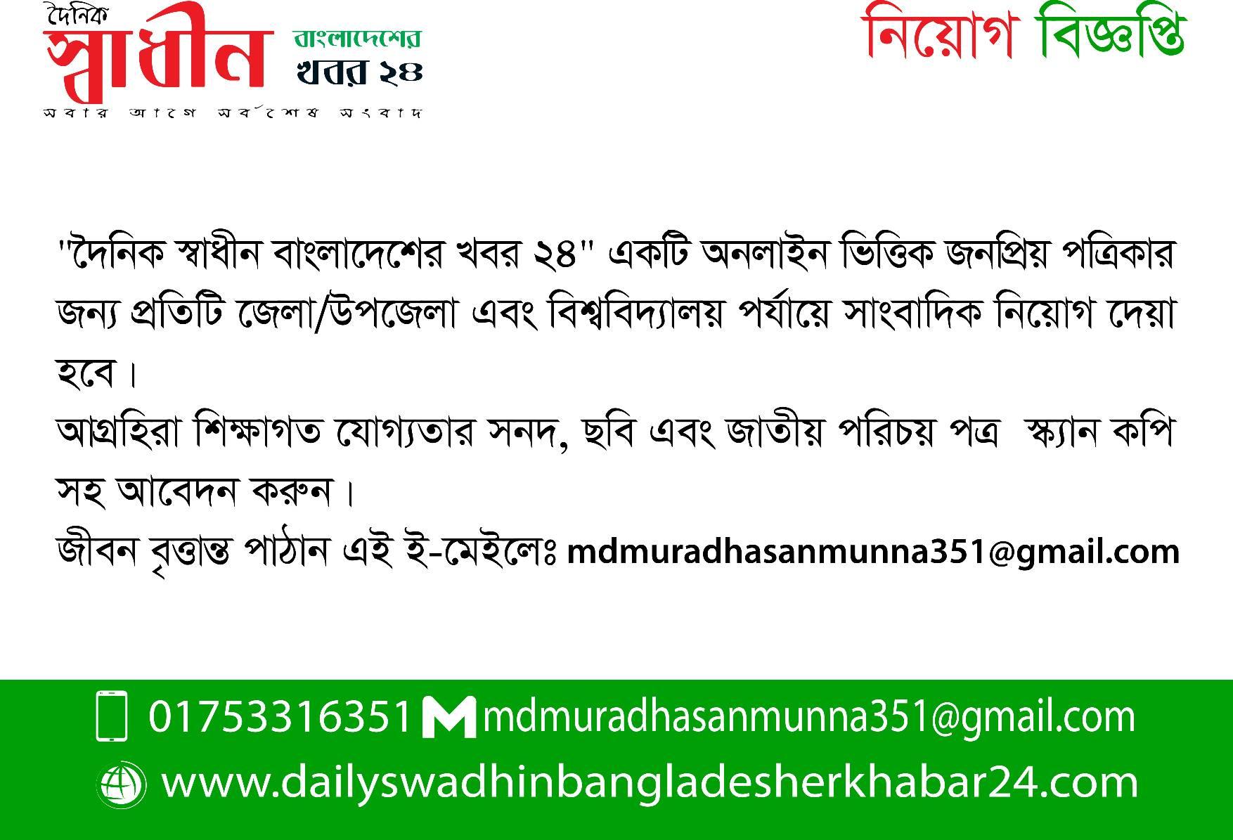 দৈনিক স্বাধীন বাংলাদেশের খবর পত্রিকার সাংবাদিক নিয়োগ দেয়া হবে।