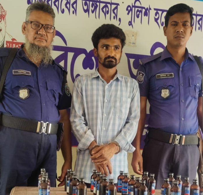 লালমনিরহাট সদর থানার অফিসার ইনচার্জ মো: এরশাদুল আলম এর যোগ্য নেতৃত্বে বিশেষ অভিযানে লালমনিরহাট থানাধীন ০৮ নং গোকুন্ডা ইউনিয়নের পূর্ব দালালপড়া মৌজাস্থ তিস্তা সড়ক সেতুর উত্তর পার্শ্বে টোলঘরের সামনে পাকা রাস্তার উপর হইতে আসামী ১ মোঃ মাসুদ রানা(৩২), পিতা-মোহাম্মাদ আলী ওরফে দুলাল, মাতা-মোছাঃ মালেকা বেগম , গ্রাম- নয়ারহাট (ধনিয়া), থানা- আশুলিয়া, জেলা –ঢাকা’কে ২৮ (আটাশ) বোতল মাদকদ্রব্য ফেন্সিডিলসহ গ্রেফতার করা হয়। এ সংক্রান্তে লালমনিরহাট থানার মামলা নং- ১৫, তারিখ- ০৫/০৫/২০২৩ খ্রিঃ, ধারা – ৩৬(১) সারণির ১৩(খ) মাদকদ্রব্য নিয়ন্ত্রণ আইন, ২০১৮ রুজু করা হয়।