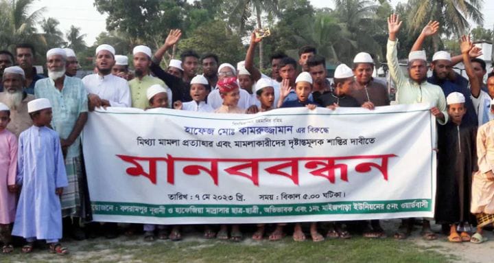 নড়াইল সদরের মাইজপাড়া ইউনিয়নের বলরামপুর নূরানী ও হাফেজিয়া মাদ্রাসার প্রধান শিক্ষক হাফেজ কামরুজ্জামানের (৫২) বিরুদ্ধে মামলা প্রত্যাহারসহ মুক্তির দাবিতে মানববন্ধন অনুষ্ঠিত হয়েছে।