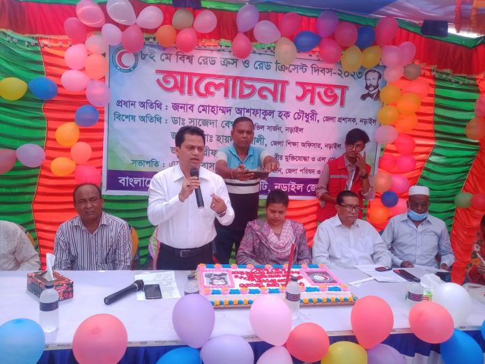 বাংলাদেশ রেড ক্রিসেন্ট সোসাইটি নড়াইল ইউনিটের আয়োজনে সোমবার সকাল ১০টায় শহরের চৌরাস্তায় র্যালী শেষে অনুষ্ঠিত আলোচনা সভায় সভাপতিত্ব করেন জেলা পরিষদ ও রেড ক্রিসেন্ট সোসাইটি নড়াইল ইউনিটের চেয়ারম্যান অ্যাডভোকেট সুবাস চন্দ্র বোস।