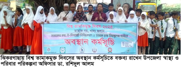 তামাক নয়, খাদ্য ফলান এই স্লোগানকে সামনে রেখে যশোরের ঝিকরগাছায় বিশ্ব তামাকমুক্ত দিবসের অবস্থান কর্মসূচি অনুষ্ঠিত হয়েছে। বাংলাদেশ তামাক বিরোধী জোট, ওয়ার্ক ফর বেটার বাংলাদেশ ট্রাস্ট, পল্লী প্রগতি সংস্থা, পেন ফাউন্ডেশন, ঝিকরগাছা রিপোর্টার্স ক্লাব, স্বজন চক্র ও বীর মুক্তিযোদ্ধা মোতাছিম বিল্লাহ শিশু একাডেমীর আয়োজনে তামাকের কর, ই-সিগারেট নিষিদ্ধ করণ ও তামাক চাষ নিয়ন্ত্রণের দাবীর কর্মসূচিতে প্রধান অতিথি ছিলেন, উপজেলা স্বাস্থ্য ও পরিবার পরিকল্পনা অফিসার ডা. রশিদুল আলম।