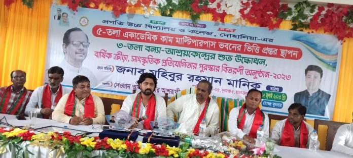 তিনি বুধবার দুপুরে সুনামগঞ্জের দোয়ারাবাজার উপজেলার দোহালিয়া ইউনিয়নের প্রগতি উচ্চ বিদ্যালয় ও কলেজের ৬ কোটি ৪৪ লাখ ৫৬ হাজার ৬শত ৯৬ টাকা ব্যায়ে ৫ম-তলা একাডেমিক কাম মাল্টিপারপাস ভবনের ভিত্তি স্থাপন করেন ও ৩য়-তলা বিশিষ্ট বন্যা আশ্রয়কেন্দ্রের উদ্বোধন এ উপলক্ষে অনুষ্টিত আলোচনা সভায় এমপি মুহিবুর রহমান মানিক আরো বলেন চলমান উন্নয়ন অব্যাহত রাখতে শেখ হাসিনার বিকল্প নেই। শেখ হাসিনার দূরদশী নেতৃত্বে পরিকল্পনামত বাংলাদেশ এগিয়ে যাবে।