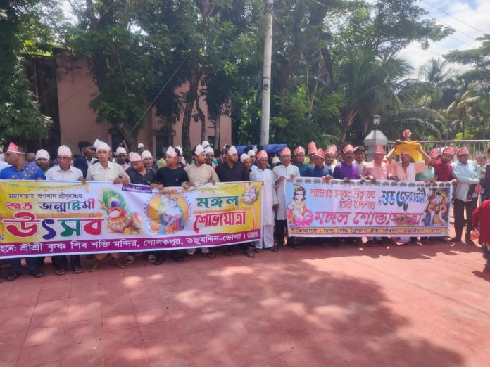 ভোলা তজুমদ্দিন উপজেলায় ৬ সেপ্টেম্বর বুধবার সকাল ১০ ঘটিকায় তজুমদ্দিন উপজেলার পূজা উদযাপন কমিটির পক্ষ থেকে আড়ালিয়া বাবাজির সমাধি মন্দির থেকে শোভাযাত্রা শুরু করে। শ্রীকৃষ্ণের জন্মাষ্টমী উপলক্ষে বিভিন্ন মন্দির থেকে,তজুমদ্দিনে শ্রী শ্রী কালী মন্দির থেকে হিন্দু বৌদ্ধ ঐক্য পরিষদের ব্যানারে র্যালি ও পদযাত্রা শুরু করে তজুমদ্দিনে পশ্চিম পাড়া হরি মন্দিরে আসে। সেখানে বিভিন্ন মন্দির থেকে নিয়ে আগত সভাপতি সেক্রেটারি মহোদয়ের ব্যানারে তজুমদ্দিন উপজেলা চত্বর থেকে উত্তর বাজার পর্যন্ত। পশ্চিমপাড়া হরি মন্দিরে এসে সমাপ্তি ঘোষণা হয়। প্রধান অতিথি হিসেবে ভিডিও কনফারেন্সে বক্তব্য রাখেন ভোলা ৩ আসনে মাননীয় সংসদ সদস্য নূরন্নবী চৌধুরী শাওন এমপি মহোদয়। আরো উপস্থিত ছিলেন তজুমদ্দিন পূজা উদযাপন কমিটির তজুমদ্দিন উপজেলা শাখা সম্মানিত সভাপতি শ্রী বাবু রূপন দে, এবং সাধারণ সম্পাদক শ্রী বাবু মিঠুল চন্দ্র সিং,ও সাংগঠনিক সম্পাদক শ্রী অন্তর দে,আরো কমিটির সদস্য বৃন্দ।