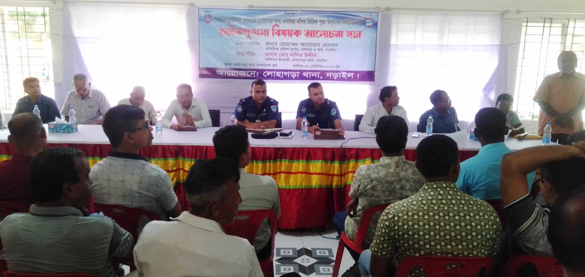শনিবার ( ৩০ সেপ্টেম্বর) বিকাল সাড়ে ৩ টায় লোহাগড়া থানা পুলিশ প্রশাসনের আয়োজনে হলরুমে থানার অফিসার ইনচার্জ (ওসি) মো: নাসির উদ্দিনের সভাপতিত্বে ও উপজেলা পূজা উদযাপন পরিষদের আহবায়ক পরীক্ষিত সিকদারের সঞ্চালনায় আলোচনা সভায় প্রধান অতিথি হিসেবে বক্তব্য রাখেন নড়াইল জেলার অতিরিক্ত পুলিশ সুপার মো:আনোয়ার হোসেন।