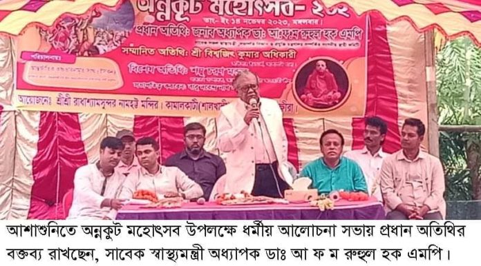মঙ্গলবার দুপুরে অনুষ্ঠিত এ আলোচনা সভায় প্রধান অতিথির বক্তব্য রাখেন, সাবেক স্বাস্থ্যমন্ত্রী অধ্যাপক ডাঃ আ ফ ম রুহুল হক এমপি। এসময় তিনি বলেন, শেখ হাসিনার সরকার ক্ষমতায় আছে তাই সাম্প্রদায়িক সম্প্রীতি অক্ষুন্ন আছে। জননেত্রী শেখ হাসিনার নেতৃত্বে স্মার্ট বাংলাদেশ নির্মাণে উন্নয়নের চিত্র বলে শেষ করা যাবে না তাই উন্নয়নের অগ্রযাত্রাকে অব্যাহত রাখতে পুনরায় নৌকায় ভোট দিয়ে কৃতজ্ঞতা প্রকাশ করুন। নরেন্দ্র নাথের সভাপতিত্বে অনুষ্ঠানে বিশেষ অতিথি হিসেবে উপস্থিত ছিলেন পুলিশ পরিদর্শক (তদন্ত) রফিকুল ইসলাম, উপজেলা আওয়ামী লীগের সাধারণ সম্পাদক শম্ভুজিৎ মন্ডল, যুবলীগ নেতা তরিকুল ইসলাম তুষার, হিন্দু বৌদ্ধ খ্রিস্টান ঐক্য পরিষদের আহ্বায়ক সাংবাদিক গোপাল কুমার ম-ল প্রমূখ।