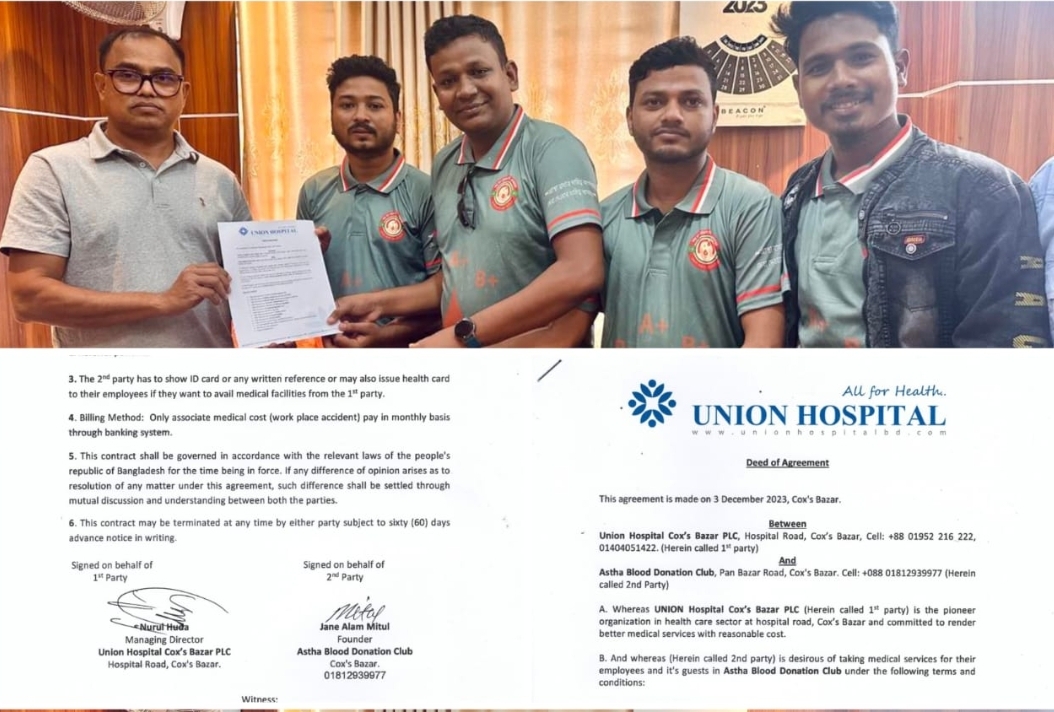 কক্সবাজার জেলার অন্যতম স্বাস্থ্যসেবা প্রদানকারী প্রতিষ্ঠান ইউনিয়ন হাসপাতালের সাথে স্বাস্থ্য বিষয়ক কর্পোরেট চুক্তি করলেন কক্সবাজার জেলার অন্যতম স্বেচ্ছাসেবী সংগঠন আস্থা ব্লাড ডোনেশন ক্লাব। আজ দুপুরে হাসপাতাল অফিস কক্ষে অত্র হাসপাতালের ম্যানেজিং ডিরেক্টর জনাব নুরুল হুদার সাথে প্রাতিষ্ঠানিক কর্পোরেট চুক্তি করেন আস্থা ব্লাড ডোনেশন ক্লাবের সম্মানিত প্রতিষ্ঠাতা জনাব, জানে আলম মিতুল।