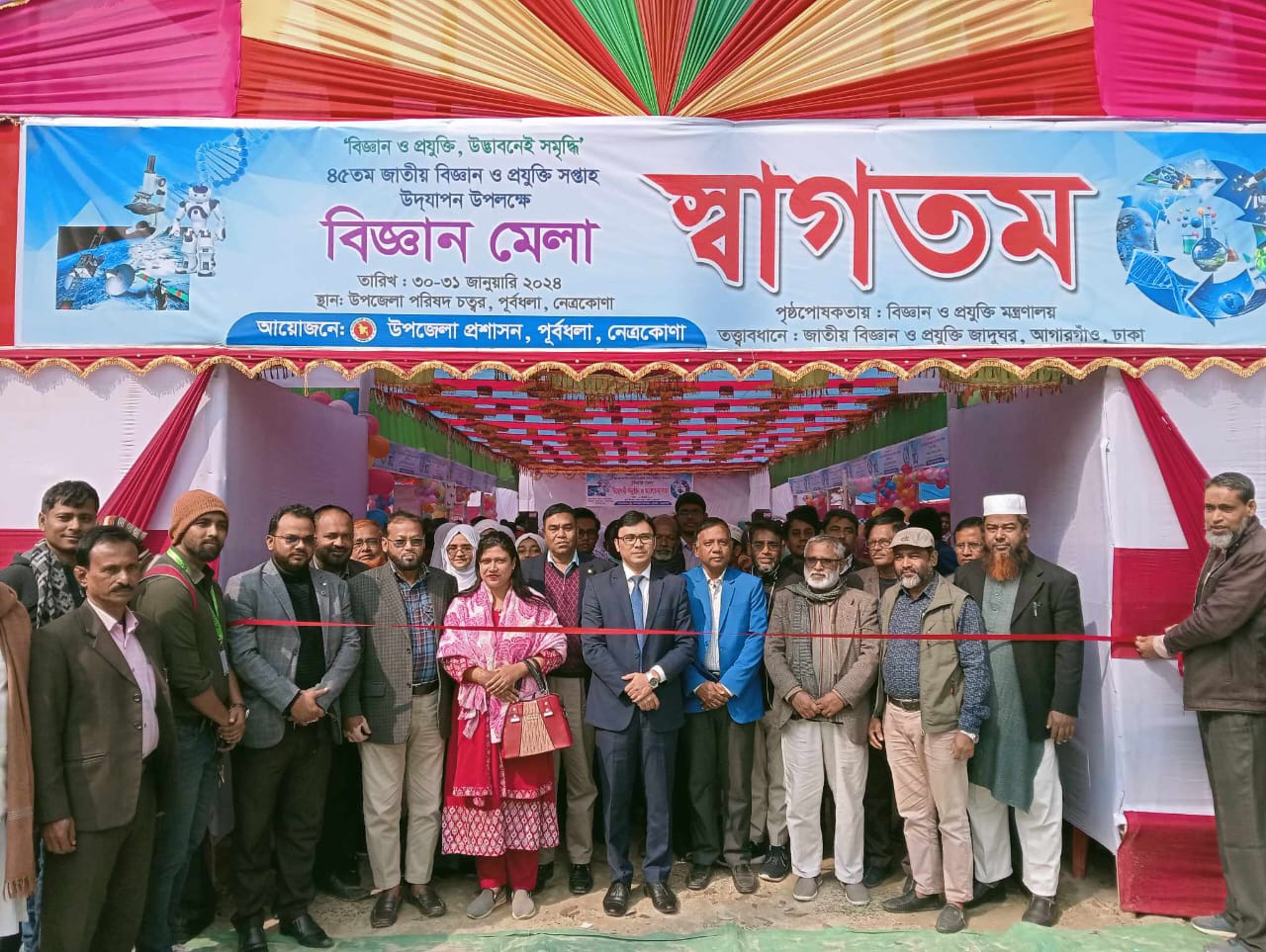 “বিজ্ঞান ও প্রযুক্তি উদ্ভাবনেই সমৃদ্ধি” এই প্রতিপাদ্যকে সামনে রেখে নেত্রকোনার পূর্বধলায় উপজেলা প্রশাসনের আয়োজনে এবং জাতীয় বিজ্ঞান ও প্রযুক্তি জাদুঘরের সহযোগিতায় ৪৫তম জাতীয় বিজ্ঞান ও প্রযুক্তি সপ্তাহ এবং ৮ম অলিম্পিয়াড উদযাপন উপলক্ষে আলোচনা সভা ও ২ দিনব্যাপী বিজ্ঞান মেলার উদ্ভোধনী অনুষ্ঠান আজ (৩০ জানুয়ারি) মঙ্গলবার উপজেলা পরিষদ মাঠে অনুষ্ঠিত হয়েছে সকাল ১০ ঘটিকায়।
