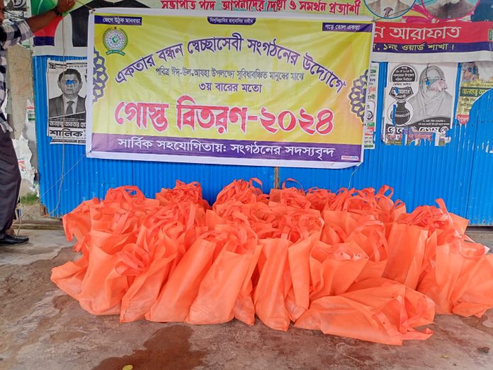 ভোলার লালমোহনে একতার বন্ধন স্বেচ্ছাসেবী সংগঠনের উদ্যোগে সমাজের গরীব অসহায় ও সুবিধা বঞ্চিত মানুষের মাঝে পবিত্র ঈদ উল আযহা উপলক্ষে কোরবানির গোশত বিতরণ করা হয়েছে।