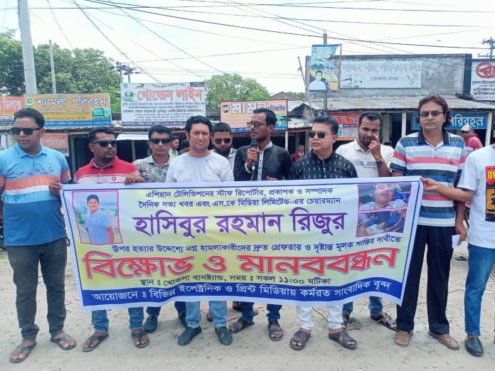 এশিয়ান টেলিভিশনের কুষ্টিয়া প্রতিনিধি হাসিবুর রহমান রিজুর ওপর নৃশংস সন্ত্রাসী হামলার প্রতিবাদে খোকসায় বিক্ষোভ মিছিল ও মানববন্ধন অনুষ্ঠিত হয়।