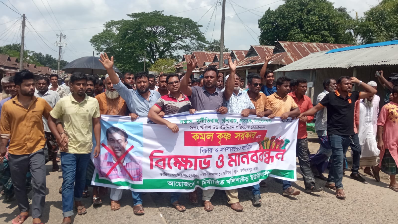 অদ্য বুধবার ১১ সেপ্টেম্বর সকাল ১১ ঘটিকায় খলিশাপুর ইউনিয়নের ফাজিলপুর বাজারে তার বিভিন্ন অনিয়ম ও বিভিন্নভাবে সাধারন মানুষকে হয়রানির অভিযোগে এ মানববন্ধন কর্মসূচি অনুষ্ঠিত হয়। এ সময় শত শত লোকজন তার পদত্যাগের দাবি করেন। অন্যথায় কঠিন আন্দোলনের হুমকি দেন মানববন্ধনকারীরা।