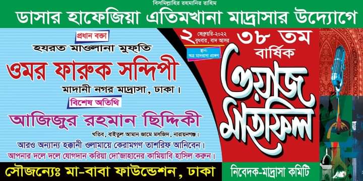 মাদারীপুরের ডাসার উপজেলার, ডাসার হাফেজিয়া এতিমখানা মাদ্রাসার উদ্যোগে আজ বেলা ০৪:০০ ঘটিকায় হাফেজিয়া মাদ্রাসা মাঠে ৩৮তম বার্ষিক ওয়াজ মাহ্ফিল অনুষ্ঠিত হয়।