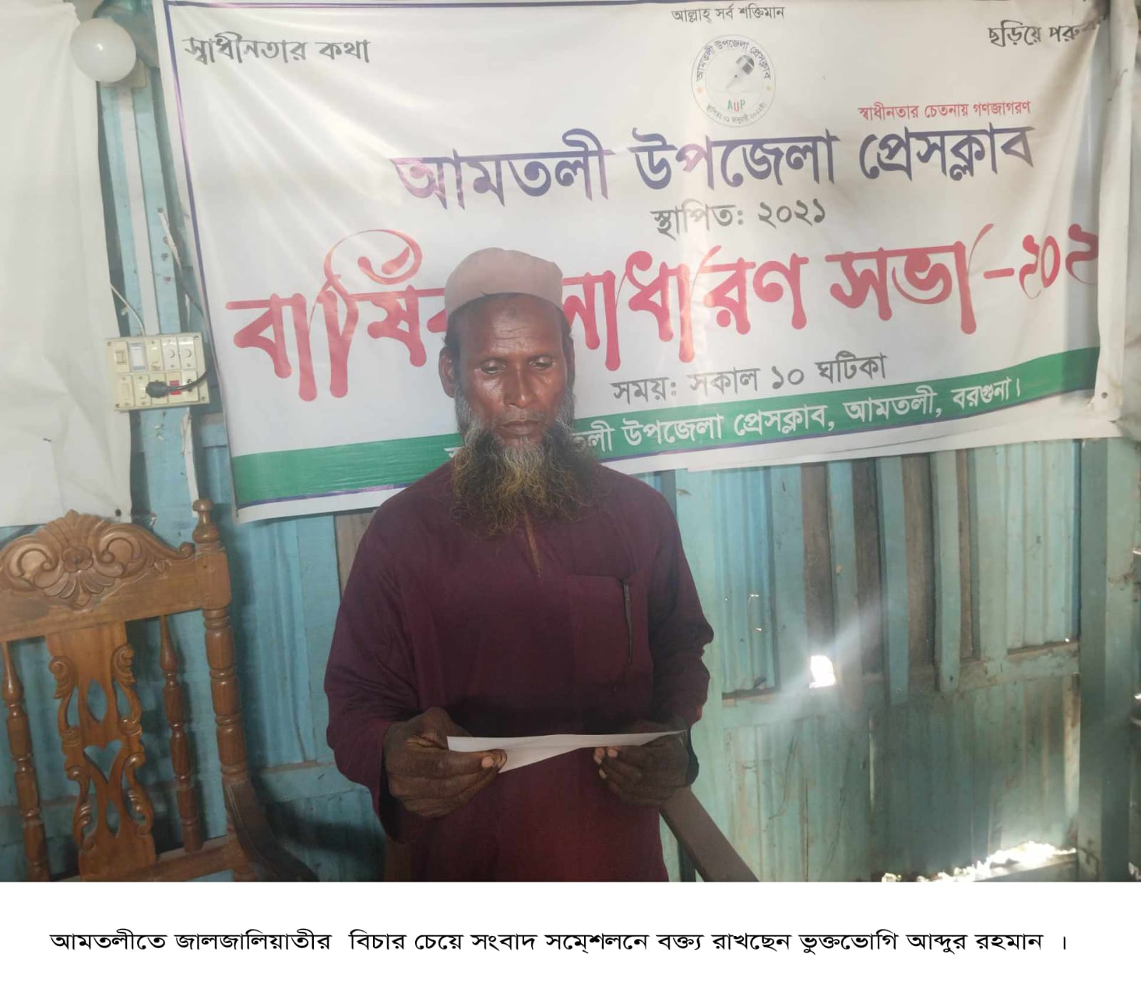 বরগুনার আমতলী উপজেলার আড়পাঙ্গাশিয়া ইউনিয়নের ঘোপখালী গ্রামের মোঃ আব্দুর রহমান সোমবার দুপুরে আমতলী উপজেলা প্রেসবøাব কার্যালয়ে জমিজমা জালজালিয়াতী কারীদের বিরুদ্ধে আইনগত ব্যবস্থা নেয়ার জন্য প্রশাসনের সহায়তা চেয়ে সংবাদ সম্মেলন করেছেন।