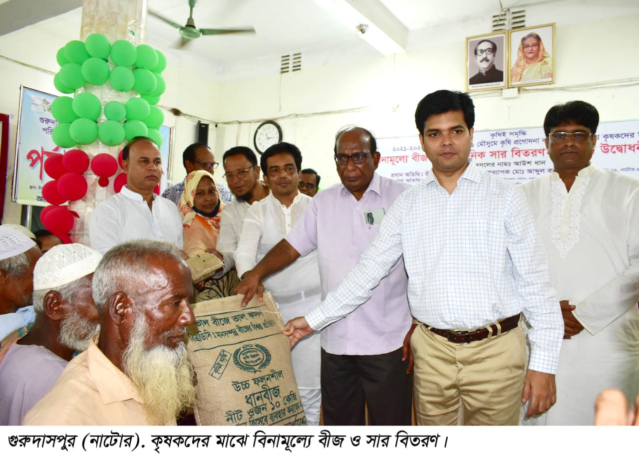 নাটোরের গুরুদাসপুর উপজেলার ১ হাজার ৮০০ জন কৃষকের মাঝে বিনামূল্যে ৫ কেজি করে ধানের বীজ ও ৩০ কেজি করে সার বিতরণ করা হয়েছে। সোমবার সকাল সাড়ে ১০টায় উপজেলা মিলনায়তনে ২০২১-২২ অর্থবছরে খরিপ-১ মৌসুমে আউশ ধান বৃদ্ধির লক্ষ্যে ক্ষুদ্র ও প্রান্তিক কৃষকদের মাঝে সরকারের কৃষি প্রণোদনা কর্মসূচির আওতায় বিনামূল্যে বীজ ও সার বিতরণের উদ্বোধনী অনুষ্ঠানের আয়োজন করে উপজেলা কৃষি সম্প্রসারণ অধিদফতর। উপজেলা নির্বাহী অফিসার মো. তমাল হোসেনের সভাপতিত্বে অনুষ্ঠানে প্রধান অতিথি হিসেবে উপস্থিত থেকে বক্তব্য রাখেন জেলা আওয়ামীলীগের সভাপতি মো. আব্দুল কুদ্দুস এমপি।