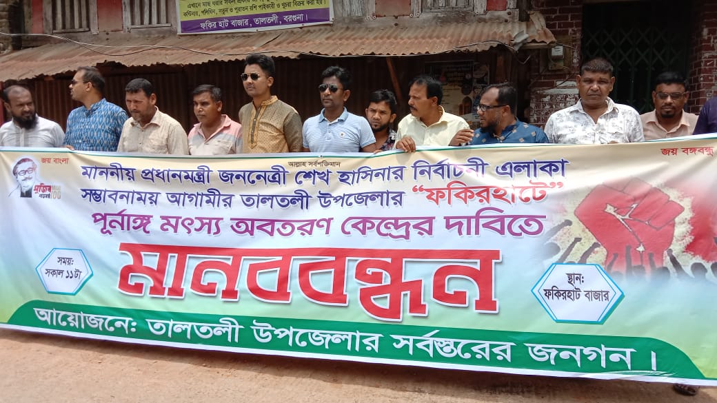 সোমবার (২৫ এপ্রিল) বেলা ১০টার দিকে উপজেলার ফকিরহাটে উপ-মৎস্য অবতরণ কেন্দ্রের অফিসের সামনে সামনে কয়েক হাজার মৎস্যজীবীসহ বিভিন্ন সেচ্ছাসেবী সংগঠনের নারী-পুরুষ মানববন্ধন করেন। পরে তালতলী উপজেলা নির্বাহী অফিসারের (ইউএনও) মাধ্যমে বিএফডিসি চেয়ারম্যান বরাবরে পূর্ণাঙ্গ মৎস্য অবতরণ ও পাইকারি কেন্দ্র হওয়ার দাবিতে স্মারকলিপি দেওয়া হয়। এ দাবির সঙ্গে একাত্বতা প্রকাশ করেন তালতলীর উপজেলা শ্রমিক ইউনিয়ন, ফকিরহাট মৎস্য আড়তদার মালিক সমিতি, মৎস্য বাজার ঘাট শ্রমিক ইউনিয়নসহ একাধিক সেচ্ছাসেবী সংগঠন।