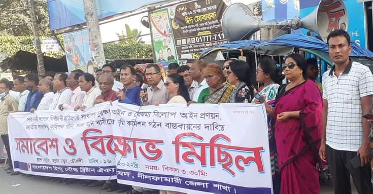 বর্তমান সরকারি দলের নির্বাচনী প্রতিশ্রুতি ও অঙ্গীকারসমুহ বাস্তবায়নের দাবিতে নীলফামারীতে মানববন্ধন সমাবেশ করেছে বাংলাদেশ হিন্দু- বৌদ্ধ-খ্রিস্টান-ঐক্য পরিষদ নীলফামারী জেলা শাখা। আজ শনিবার বিকেলে(১৬জুলাই) শহরের চৌরঙ্গী মোড়ে এই মানববন্ধন কর্মসুচি পালন করা হয়। মানববন্ধন শেষে অনুষ্ঠিত সমাবেশে সভাপতিত্ব করেন বাংলাদেশ হিন্দু- বৌদ্ধ-খ্রিস্টান-ঐক্য পরিষদ নীলফামারী জেলা শাখার সভাপতি খোকারাম রায়। সমাবেশে বক্তব্য দেন সংগঠনের সাধারণ সম্পাদক মৃণাল কান্তি রায়।তিনি সকলের উদ্দেশ্য বলেন বাংলাদেশ একটি ধর্মনিরপেক্ষ দেশ এদেশে সকলের সমান অধিকার আছে।