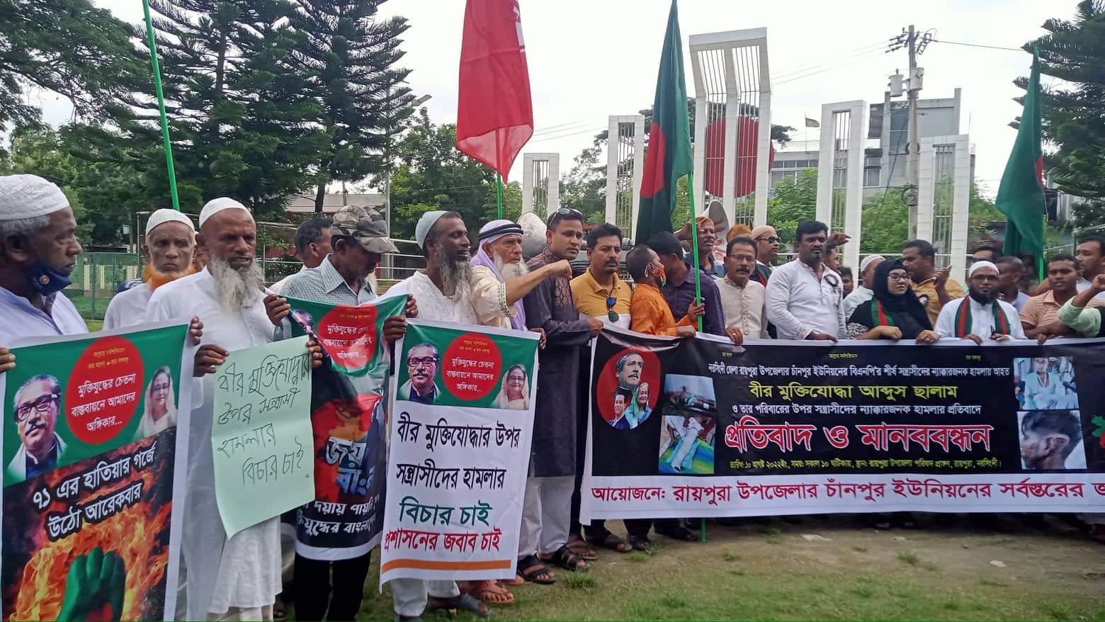 নরসিংদীর রায়পুরায় বীর মুক্তিযোদ্ধা আব্দুস ছালামের উপর প্রতিপক্ষের লোকজন বর্বরোচিত হামলার প্রতিবাদে মানববন্ধন ও বিক্ষোভ মিছিল করে জেলা ও উপজেলার মুক্তিযোদ্ধা এবং মুক্তিযোদ্ধা সন্তান কমান্ড।